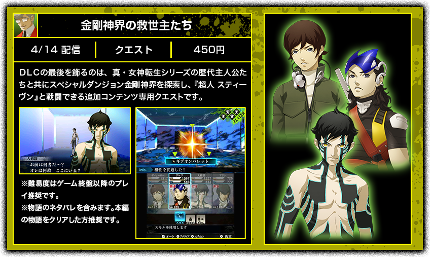 Shin Megami Tensei IV Final is getting more DLC on April 14th in Japan. A video released by Atlus shows the DLC in action, with new fights, dungeons, and even featuring protagonists from the previous Shin Megami Tensei games. Watch it below: