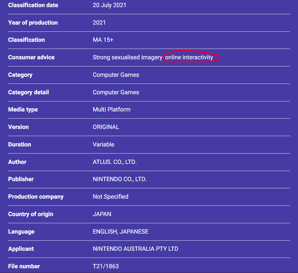 The Australian classification for Shin Megami Tensei V has been released and there’s an interesting tidbit about online listed in the consumer advice. As seen below, the consumer advice section of the classification gives the warning of “online interactivity,” typically meaning that there is an online element to the game that is not rated by the ratings board.