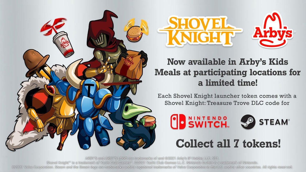 Yacht Club Games has teamed up with Arby’s for a special promotion. In Kids Meals at participating locations, Shovel Knight launcher tokens are available. Each token contains a Shovel Knight: Treasure Trove DLC code for Switch as well as Steam.