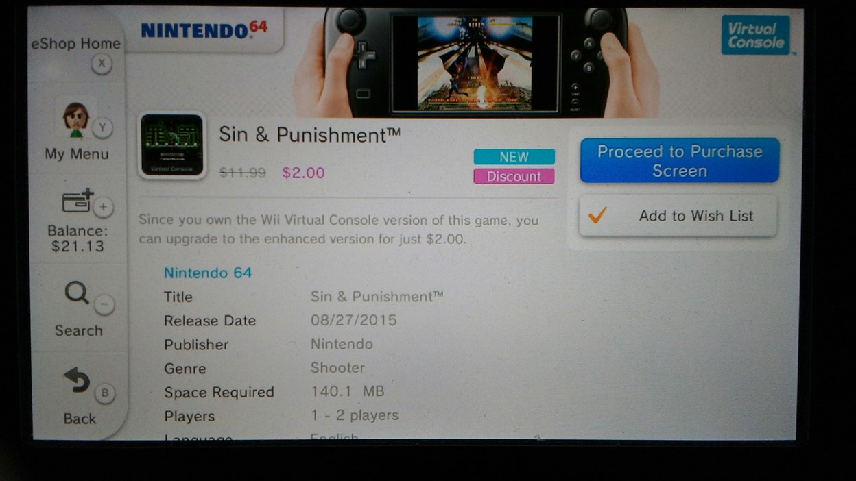 All N64 Virtual Console games on the Wii U cost $9.99 – with one exception. Sin & Punishment, which launched on the North American eShop this past Thursday, has an asking price of $11.99.