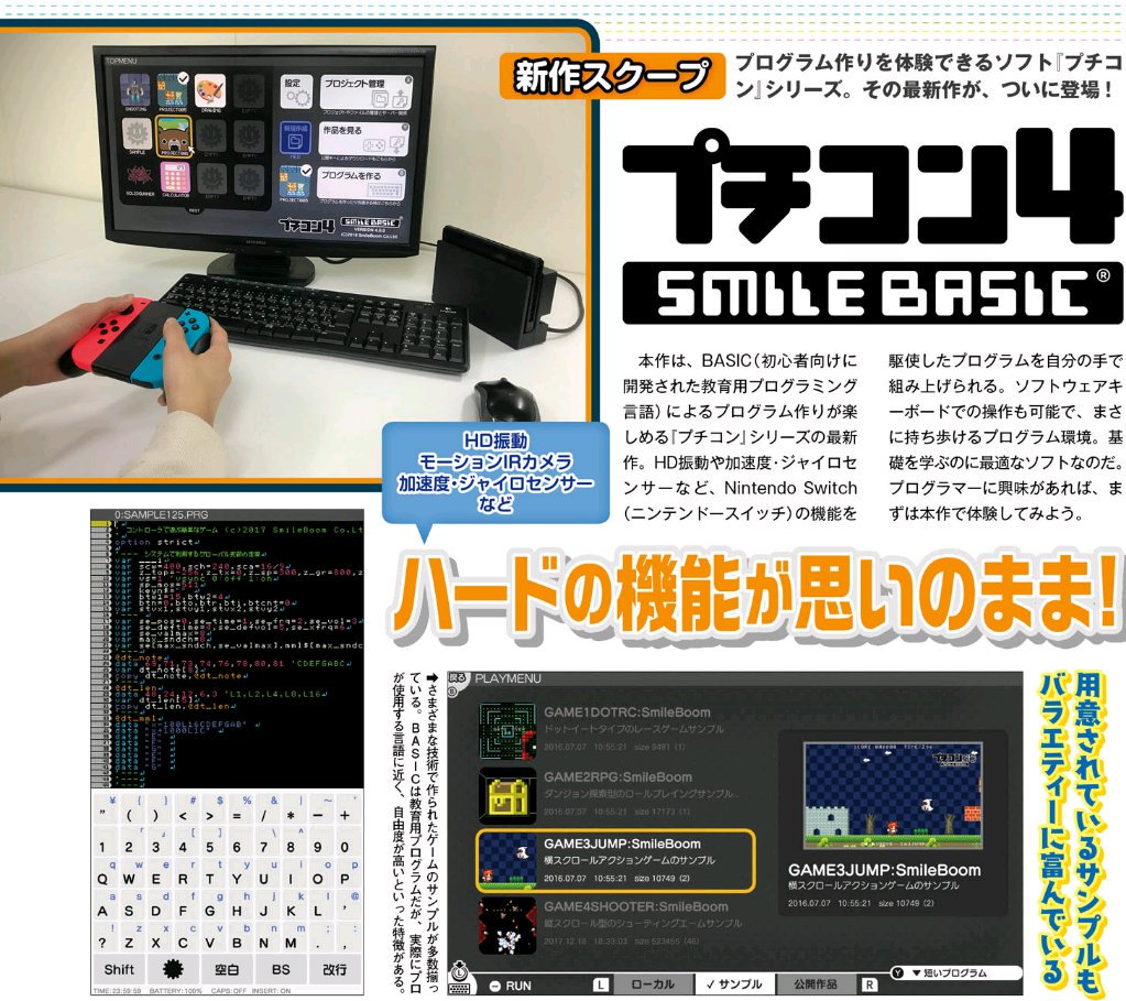Switch will be getting Puchicon 4 SmileBASIC. The app will teach you thoroughly in BASIC programming, lets you use Switch features like HD Rumble, the motion IR camera, gyro controls, and more. Online features are also supported in which you can publish or even backup games.