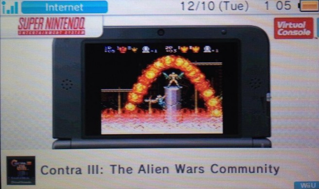 Nintendo may have plans to bring SNES games to the Virtual Console on 3DS. While there isn’t any sort of concrete proof, accessing Miiverse from the handheld and checking out the Contra III: The Alien Wars community shows the game running on a 3DS XL in the header. No SNES titles are currently available on 3DS (including Contra III), so this is an interesting finding for sure.