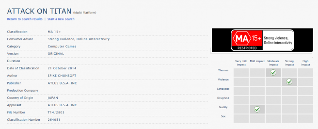Spike Chunsoft’s Attack on Titan rated in Australia, Atlus listed as publisher