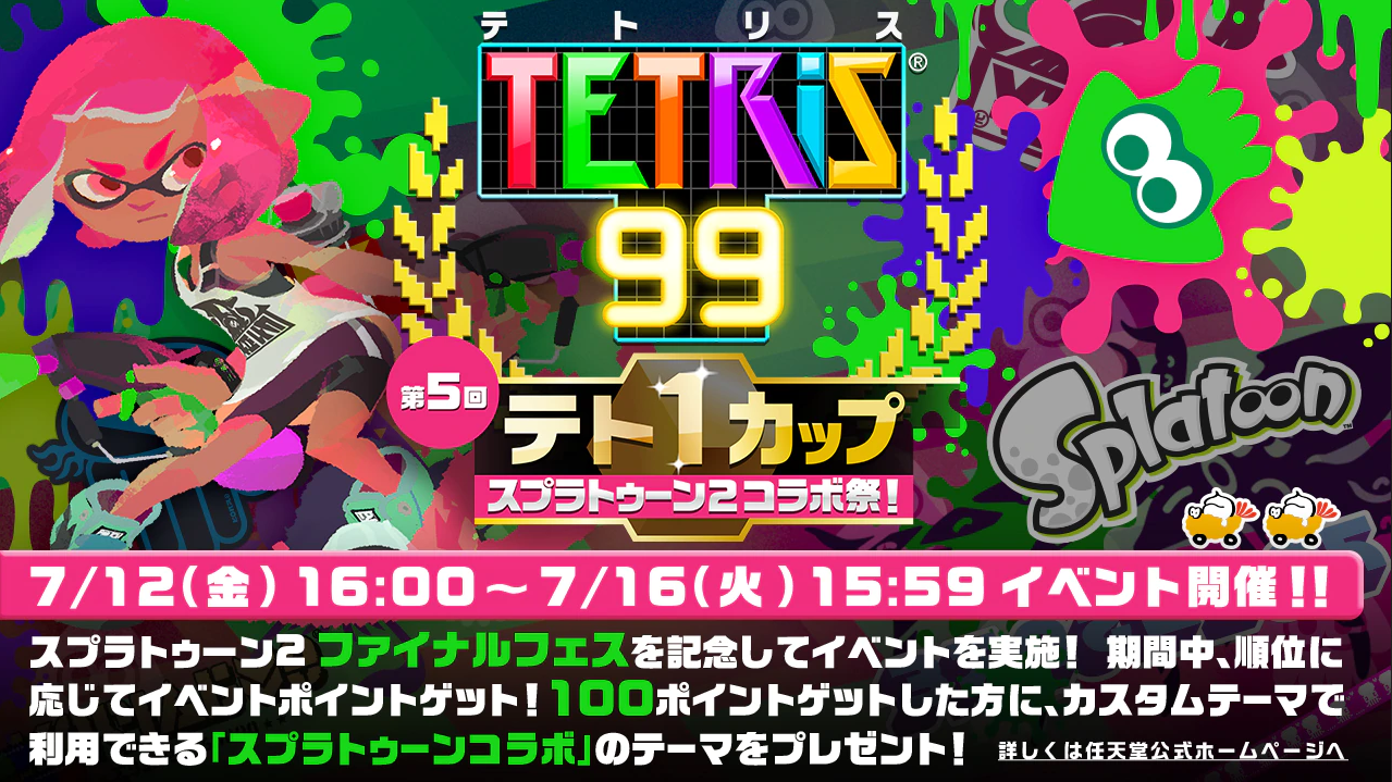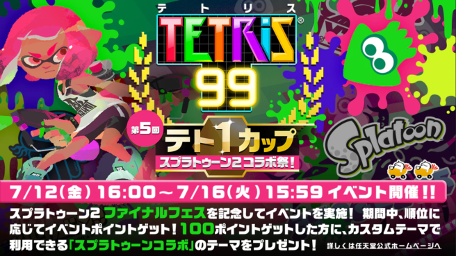 Nintendo announced today that the next online competition event for Tetris 99 (known as the Grand Prix or Maximus Cup, depending on your region) will be Splatoon-themed to celebrate the final Splatfest taking place soon in Splatoon 2. At the moment, this event has only been announced for Japan, so it’s not known yet if this competition will also have a Splatoon theme in Europe and North America. At any rate, the Japanese event will take place from 4 PM JST on July 12 till 4 PM JST on July 16. During the event, all matches will have a special Splatoon theme applied to them. Players who get at least 100 points during the event will receive that Splatoon theme and can use it in regular games after the event has finished.