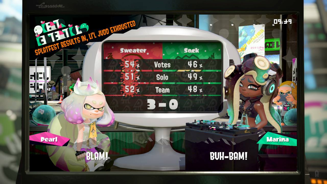 All aspects of this Splatfest were very close. Just a few percentage points separated popularity and wins. But in the end, Team Sweater came out on top in each category and won by a score of 3-0.