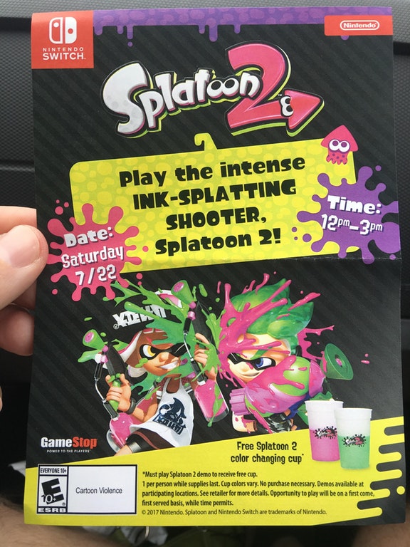 GameStop’s Splatoon 2 event will be held next Saturday. You can stop by between 12 PM and 3 PM local time. In order to get the cup, you’ll need to play Splatoon 2 at GameStop.
