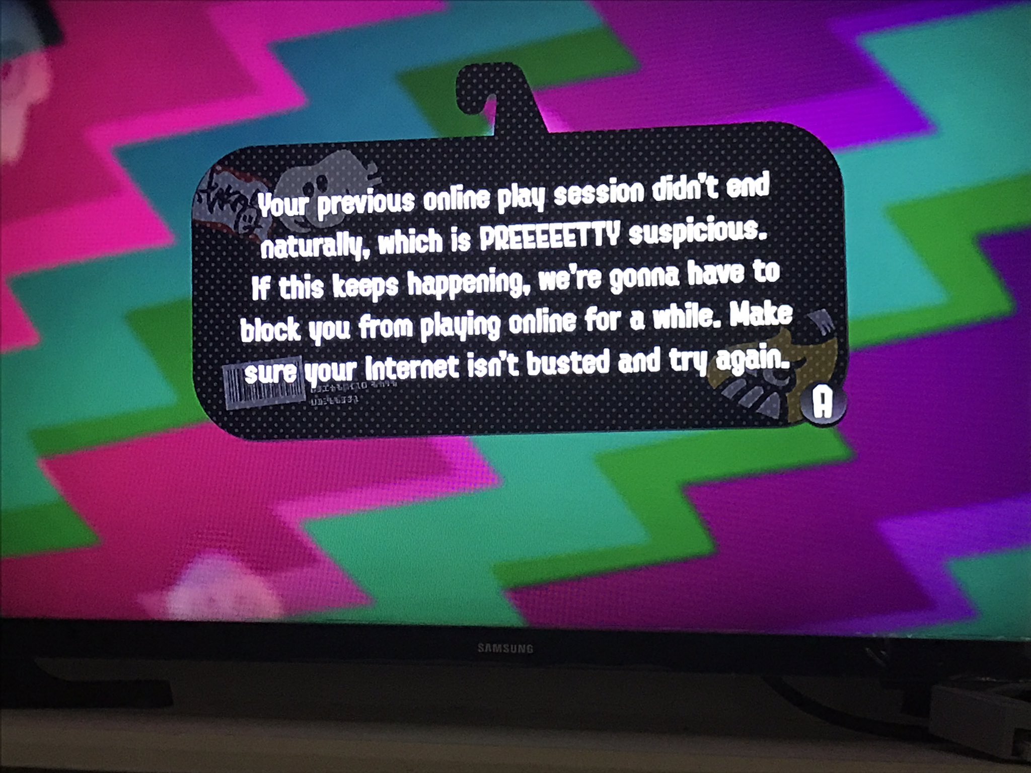 Splatoon 2 appears to dish out temporary punishments for repeated disconnects. After disconnecting online four times due to issues with their connection, player hypwnotic received the message above. It warns that you’ll be unable to play online “for a while” due to play sessions not ending “naturally”.