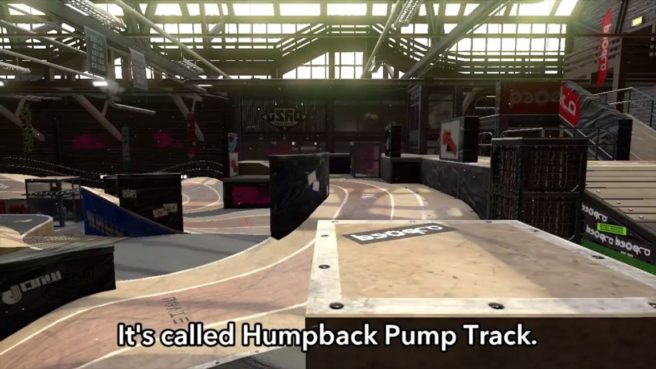 “Introducing Humpback Pump Track. This new stage is an indoor BMX track, but Inklings use it as a stage for Turf War. It features many curvy ups and downs, and the bike track surrounds a small hill in the middle. You’d think the openness makes for great visibility, but the hump abundance creates a surprising amount of blind spots. Inklings can employ multiple strategies, including frontal breakthroughs or attacking from the side.