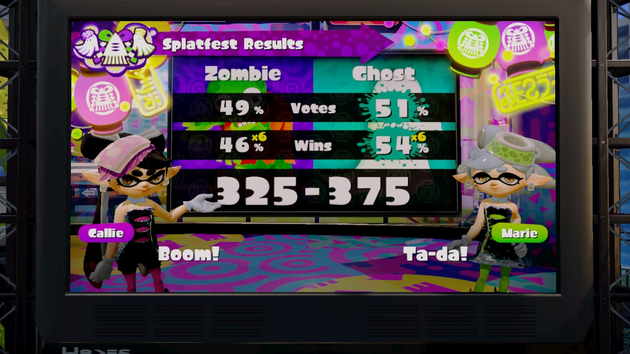 Ghosts beat out zombies thanks to a slight edge in popularity and wins. The final score was 375 points for ghosts and 325 points for zombies.