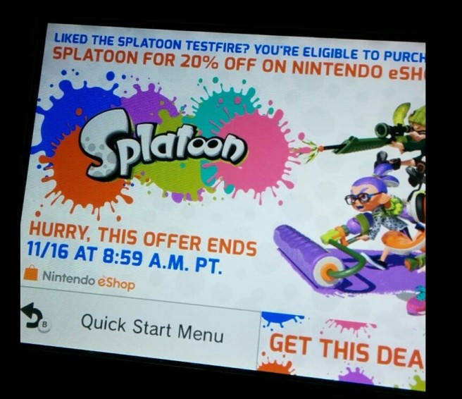 Did you download and play Splatoon Global Testfire back when the demo was made available? If so, you should be eligible for a 20% discount on the full game from the eShop. This offer is valid in North America through November 16 at 11:59 AM ET / 8:59 AM PT.
