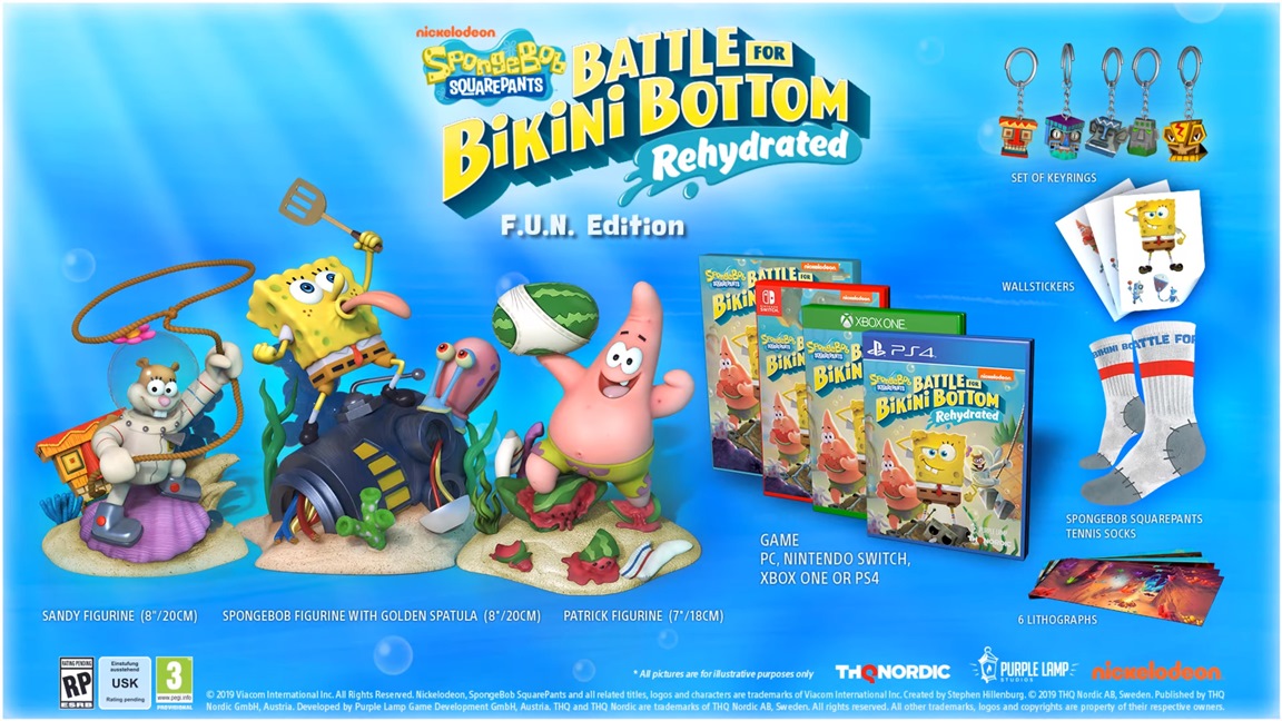 The Shiny Edition includes the game, SpongeBob figurine, wallstickers, six lithographs, and tennis stocks. You’ll get all of this in the F.U.N. Edition, but that version also packs in figurines for Patrick and Sandy plus keyrings.