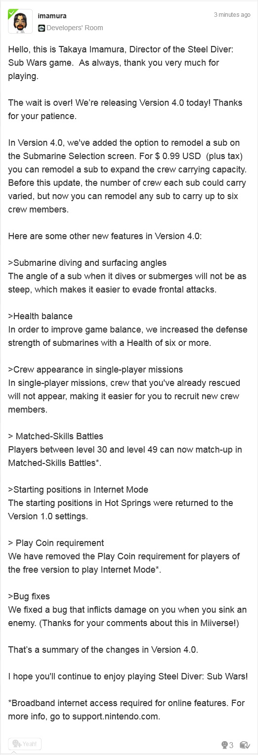 Steel Diver director Takaya Imamura took to Miiverse this afternoon to announce a 3.0 update for the free to play eShop hit. The update features friends battle over wi-fi, multiplayer maps exclusive to local battles and much more.