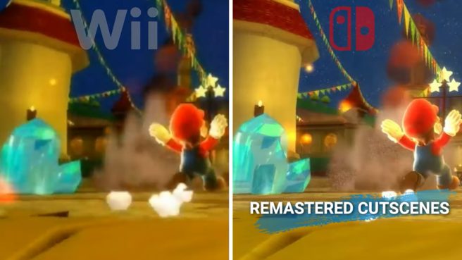 GameXplain took a closer look at the footage shown thus far, which reveals some enhancements. Super Mario 64, for instance, can be seen with higher resolution textures and improved texture filtering. Super Mario Sunshine and Super Mario Galaxy sport remastered cutscenes. Also, with Super Mario 64, has new button prompts.