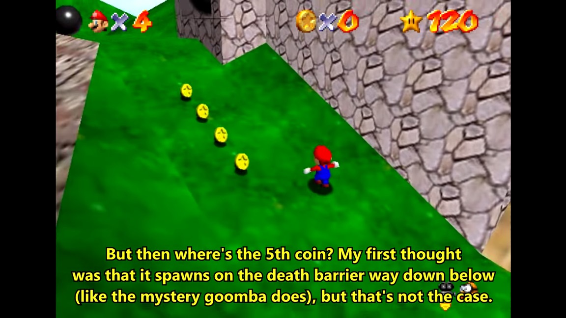 Coins in Super Mario 64 spawn in sets of five. They also come in several pre-set patterns. Yet as you can see above, one area in the Tiny-Huge Island level features a line of four coins. YouTube user UncommentatedPannen has a theory about it all.