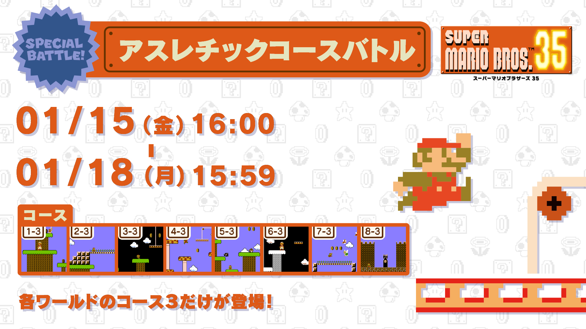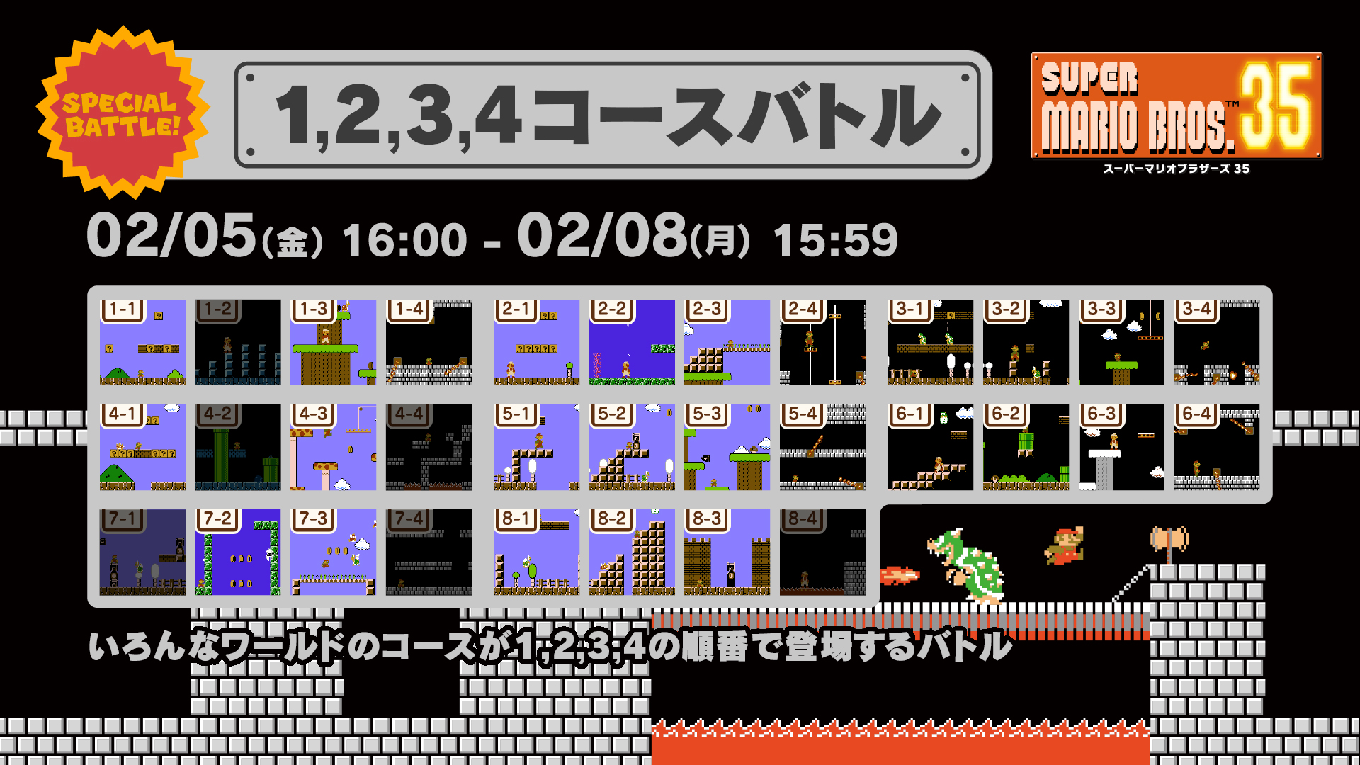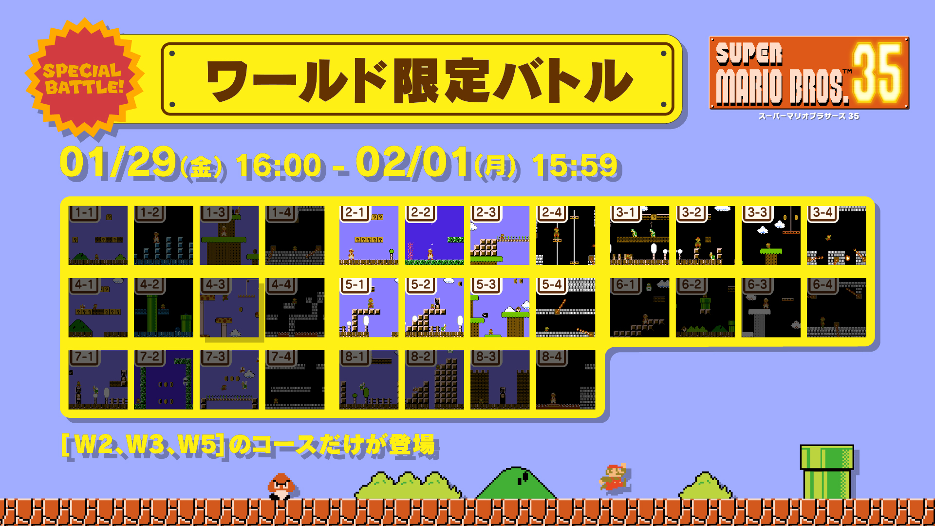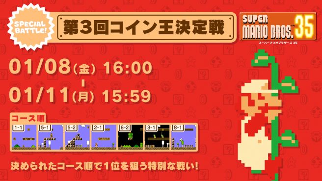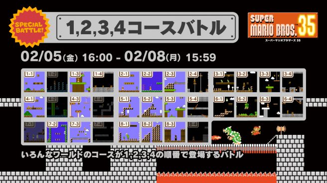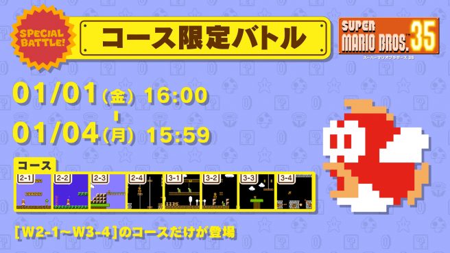 Super Mario Bros. 35 will be starting the new year with its latest event. A Limited Course Special Battle is planned, in which players will only encounter the stages 2-1 through 3-4. Nintendo suggests that those who don’t normally try out Special Battles give it a shot as earlier levels aren’t as difficult to play through.