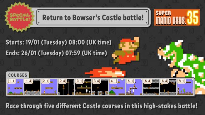 Nintendo has detailed the latest Super Mario Bros. 35 Special Battle event that is currently available. Lasting until January 26, this event, Return to Bowser’s Castle Battle, focuses on Castle themed courses, featuring stages 1-1, 1-4, 2-1, 2-4, 3-1, 3-4, 4-1, 5-1, 5-4, 6-4, and 8-1.