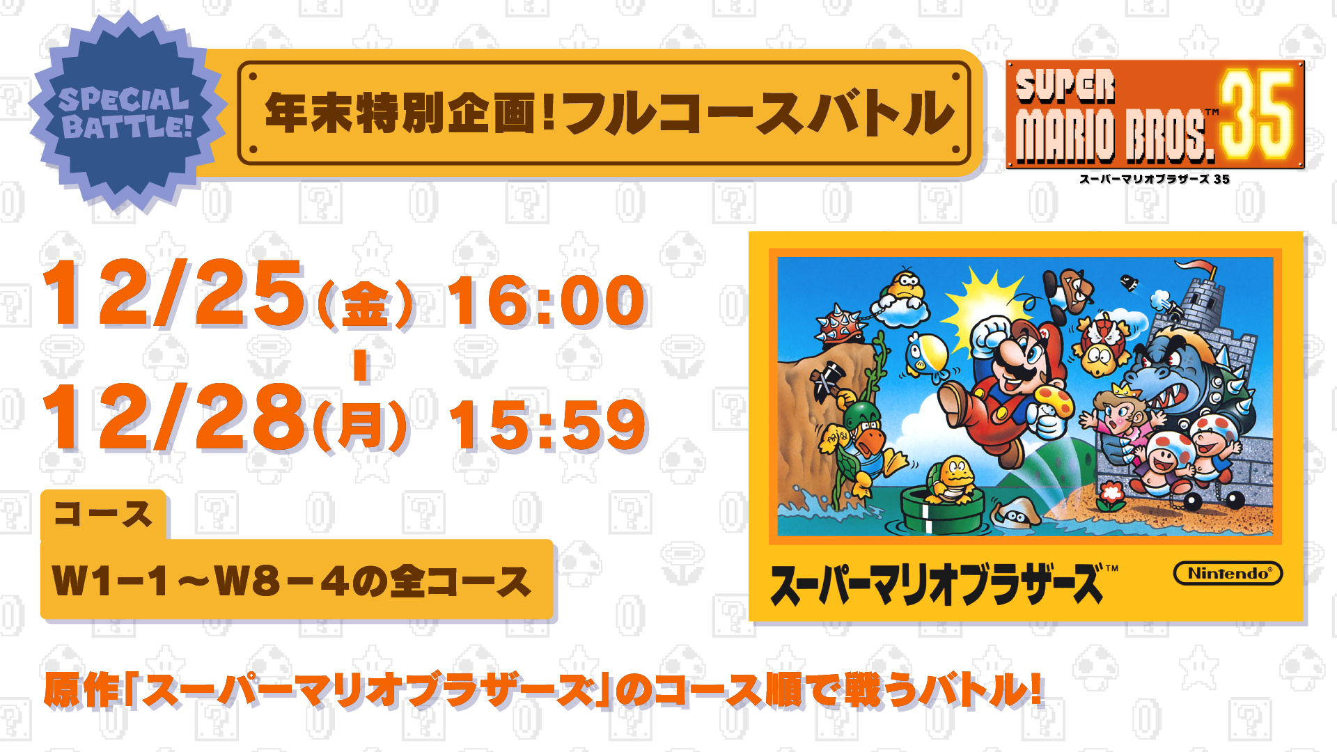 Nintendo is ending 2020 with a new Special Battle for Super Mario Bros. 35. Players will be able to take on every course from the original Super Mario Bros. in order of appearance. That means 1-1 through 8-4 will all be present.
