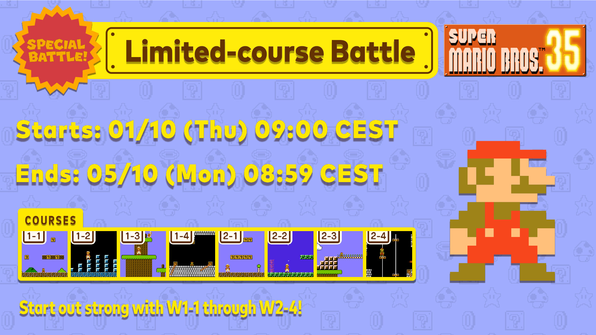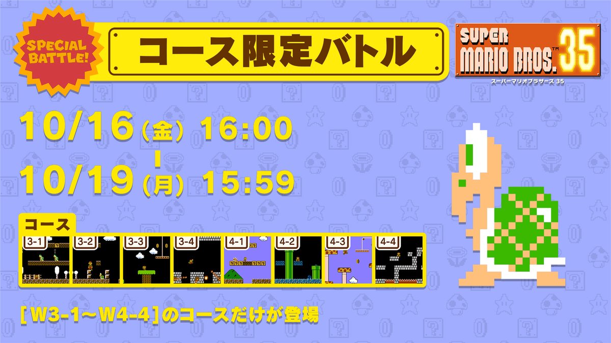 Nintendo has announced the next Special Battle for Super Mario Bros. 35. Courses are the focus here, and stages between 3-1 and 4-4 will be featured.