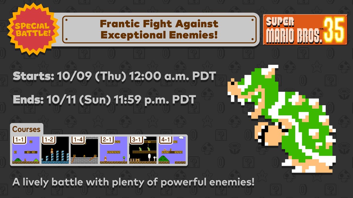 Super Mario Bros. 35 launches today for Nintendo Switch Online members, and in celebration, Nintendo has announced that a Special Battle event will take place. During this event, players will compete in limited courses from Worlds 1 and 2.