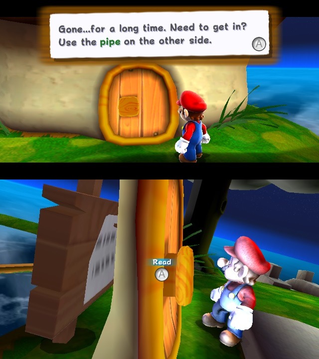 Tumblr page “Supper Mario Broth” uncovered a bit of craftiness Nintendo used here. Players are actually interacting with a signpost through the door, meaning Nintendo repurposed the sign for new functionality. By doing so, the developers didn’t have to create a readable door object from scratch. We’ve seen this sort of thing in other games before, but it’s interesting to see it here as well!