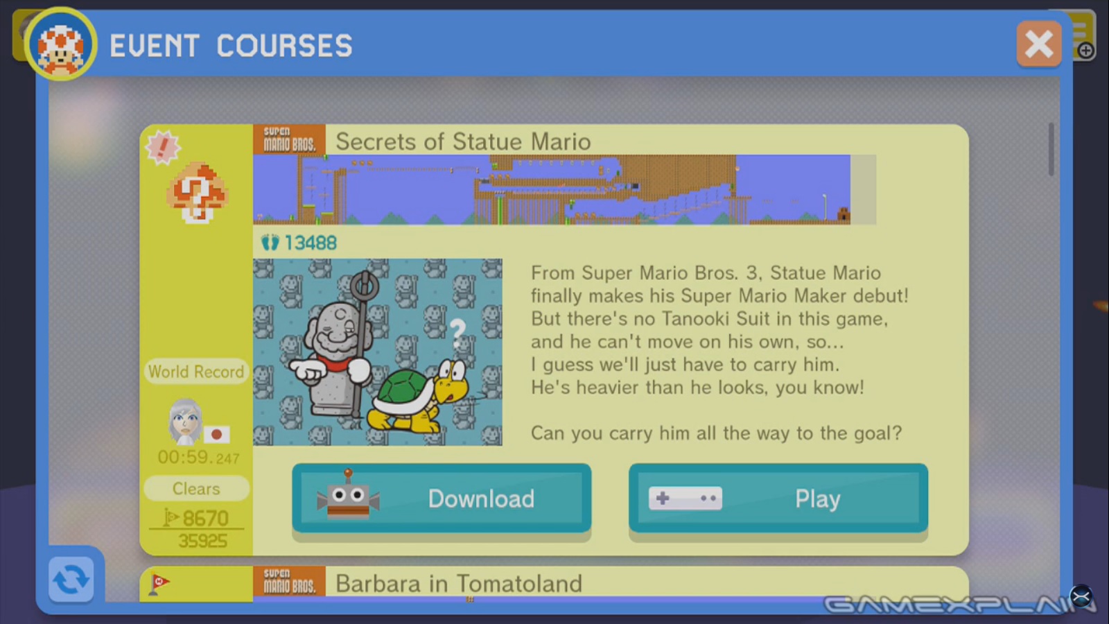 “From Super Mario Bros. 3, Statue Mario finally makes his Super Mario Maker debut! But there’s no Tanooki Suit in this game, and he can’t move on his own, so… I guess we’ll just have to carry him. He’s heavier than he looks, you know!