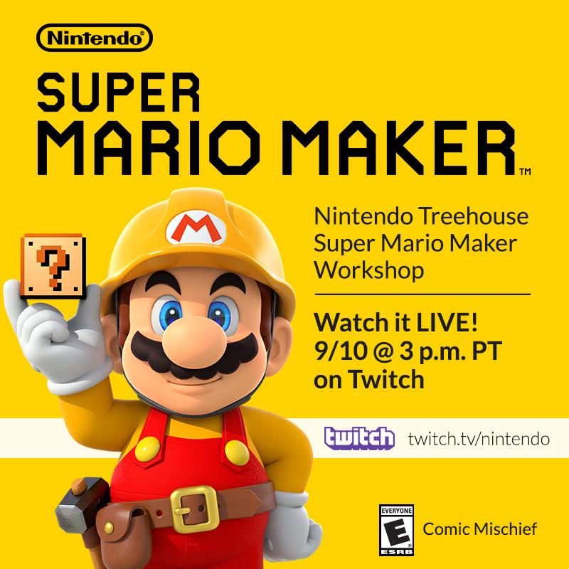 On 9/10 at 3 p.m. PT, Nintendo Treehouse will host a #SuperMarioMaker level-design workshop live on Twitch! pic.twitter.com/bOuDz2m2ru