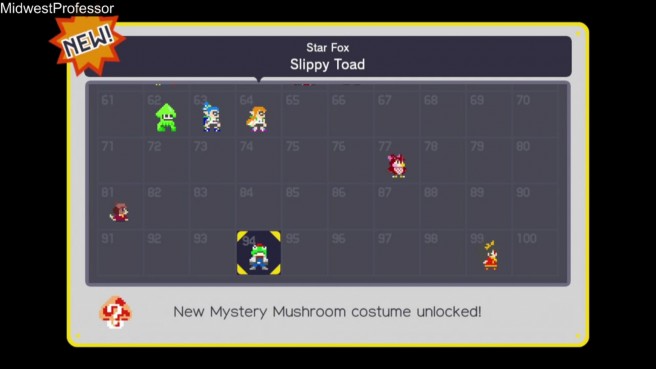 YouTube user MidwestProfessor has posted another video from Super Mario Maker, and we’re able to see even more costumes from the game. One of the unlockable outfits is none other than Slippy Toad from Star Fox. Check out the video below.