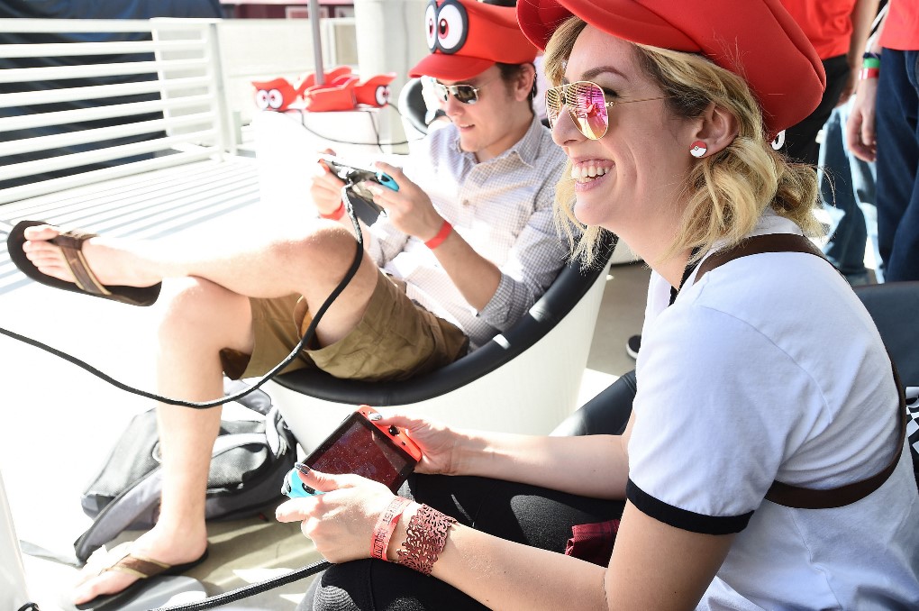 In this photo provided by Nintendo of America, YouTube personalities Meghan C. of Strawburry17 and Roger D. of RogersBase play the Super Mario Odyssey game on the Nintendo Switch system at the Super Mario Odyssey Tour Kick-off Event at Universal CityWalk in Los Angeles. Fans had the opportunity to demo the game and meet Mario at the start of his cross-country tour to celebrate his new game, Super Mario Odyssey, which launches exclusively for Nintendo Switch on Oct. 27.