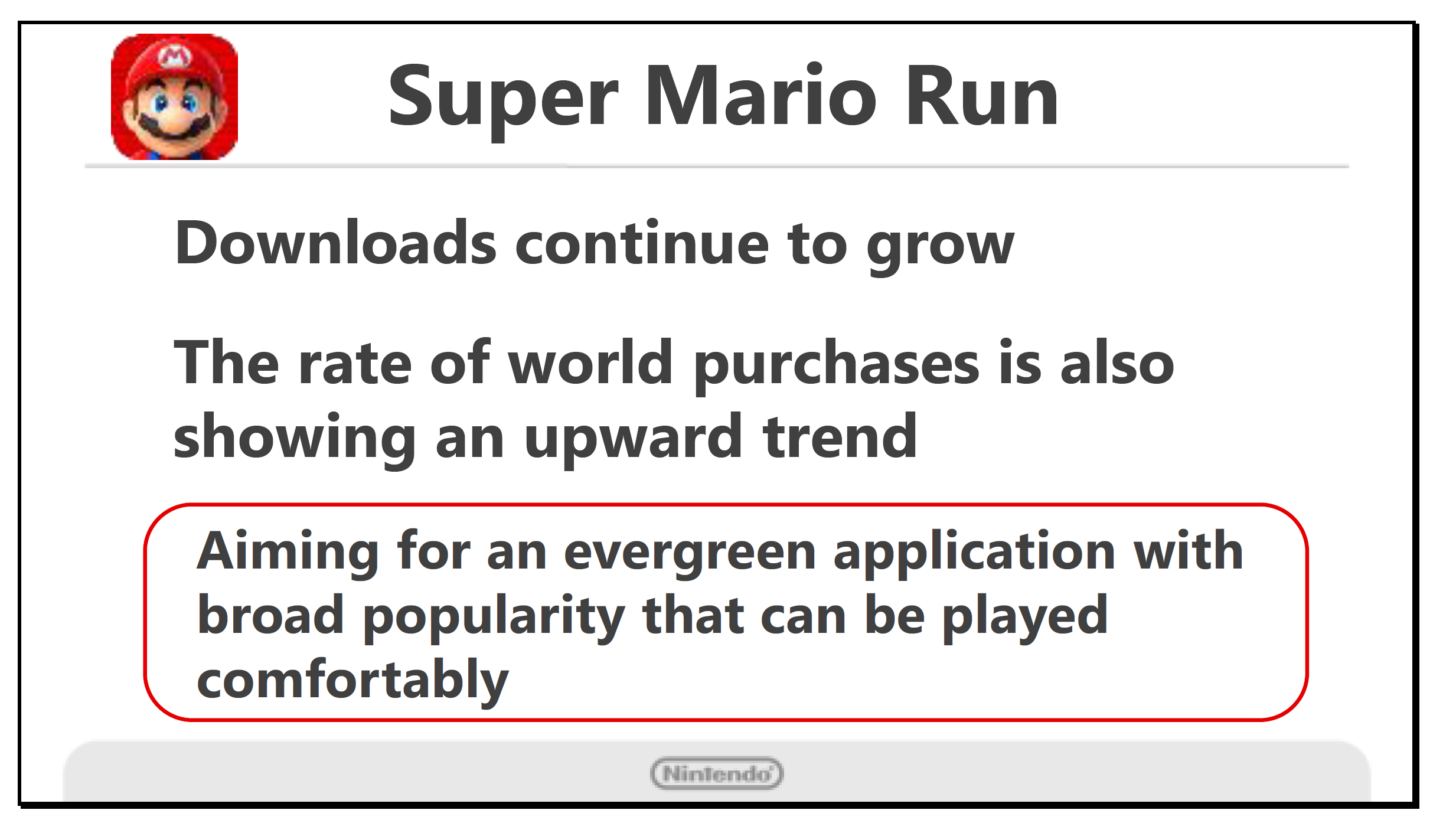 Following these principles, we released a new type of Mario game that you can play with one hand, Super Mario Run. It launched on iPhone and iPad in December. This release was not limited to the countries and regions in which we have offered products and services through our dedicated video game system business, and it reached a wide range of consumers worldwide. As we shared through a previous press release, in its first four days Super Mario Run was downloaded more than 40 million times, a record speed for the App Store. Since then, downloads have maintained a strong pace, and as of today the application has reached 78 million downloads.