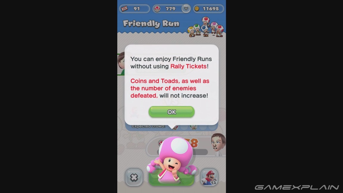 Super Mario Run has added a new mode, which is essentially a risk-free version of Toad Rally. You can race against specific friends and see how they’re doing at courses, and you don’t need Rally Tickets to play, nor will you lose (or gain) Toads. You can also only play Friendly Run a set number of times a day; If you haven’t cleared the first world, you can only play once a day. Clearing World 1 will allow you to play three times, and clearing World 2 will let you play five times. Run after the break to see the full notification from Nintendo: