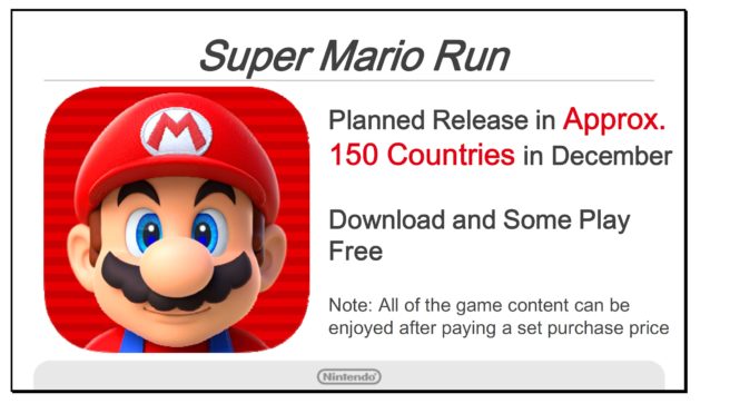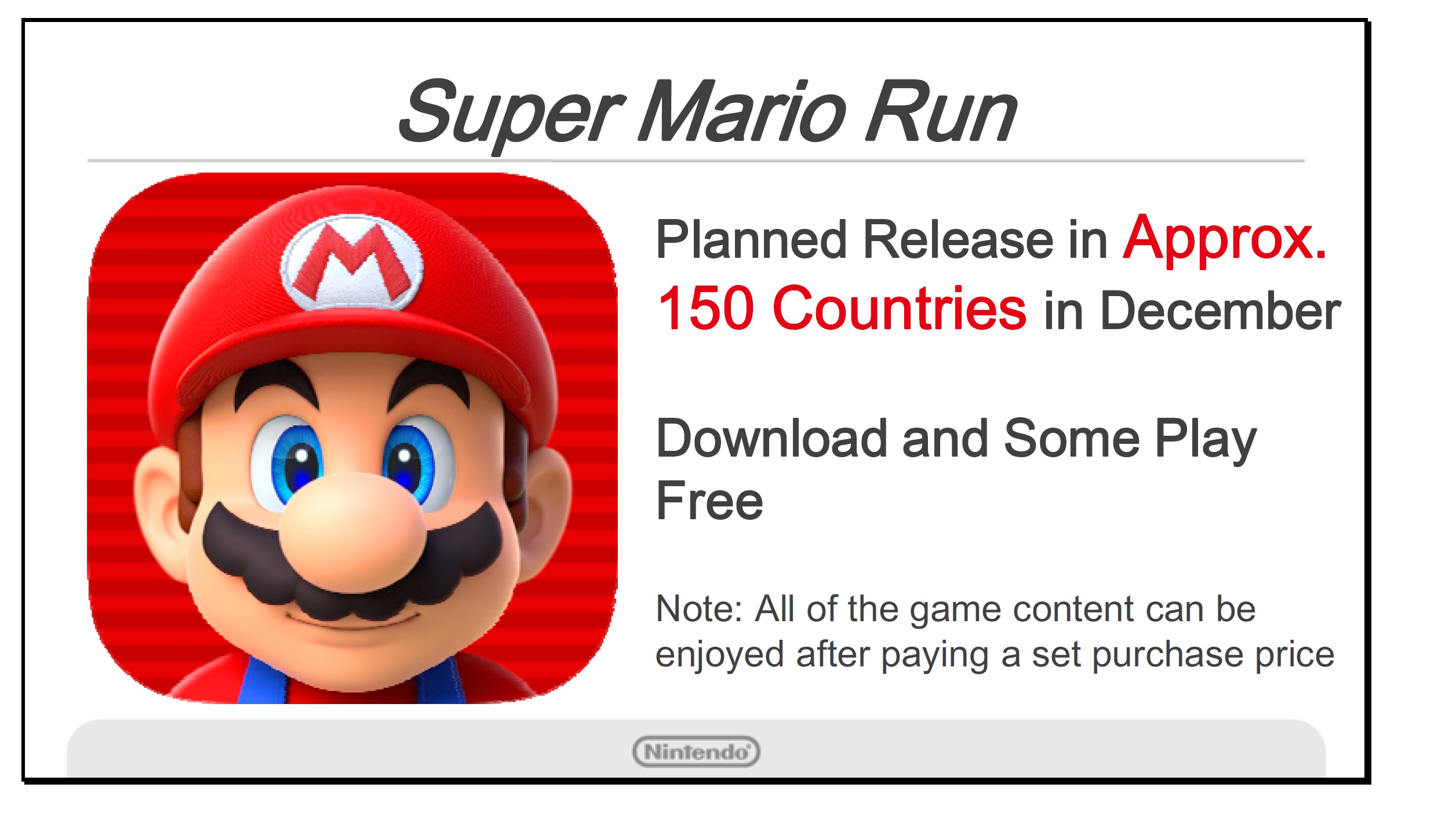 Previously, we announced that we would be releasing Super Mario Run in more than 100 countries, but we can now say that we plan to release this title in approximately 150 countries for iPhone and iPad in December. Although we have not announced the release timing yet, we are also developing an Android version. Downloading Super Mario Run will be free, as will some of the play elements. All of the game content will be enjoyable after paying a set purchase price. With our current plan, once a set purchase price is paid, consumers can repeatedly play the game without worrying about additional fees required. So, children can also play it with peace of mind. We will announce further details, including pricing, at a later date.