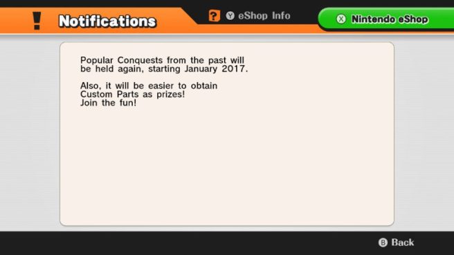 A notice has appeared in Super Smash Bros. for Wii U about the game’s Conquest feature. Beginning in January, popular Conquests will be returning. Players will also find that Custom Parts will be easier to obtain.