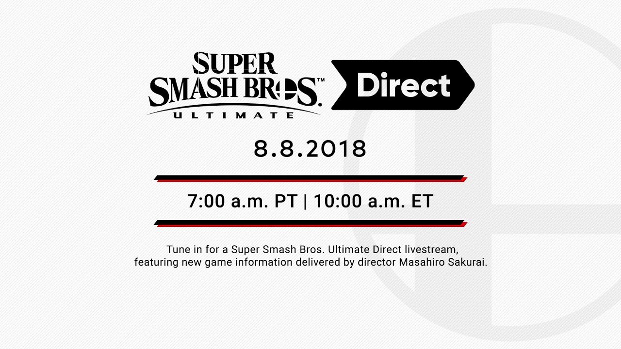 A new Super Smash Bros. Direct will air on August 8, Nintendo has announced. The presentation will deliver the latest information about Smash Bros. Ultimate, as hosted by director Masahiro Sakurai.
