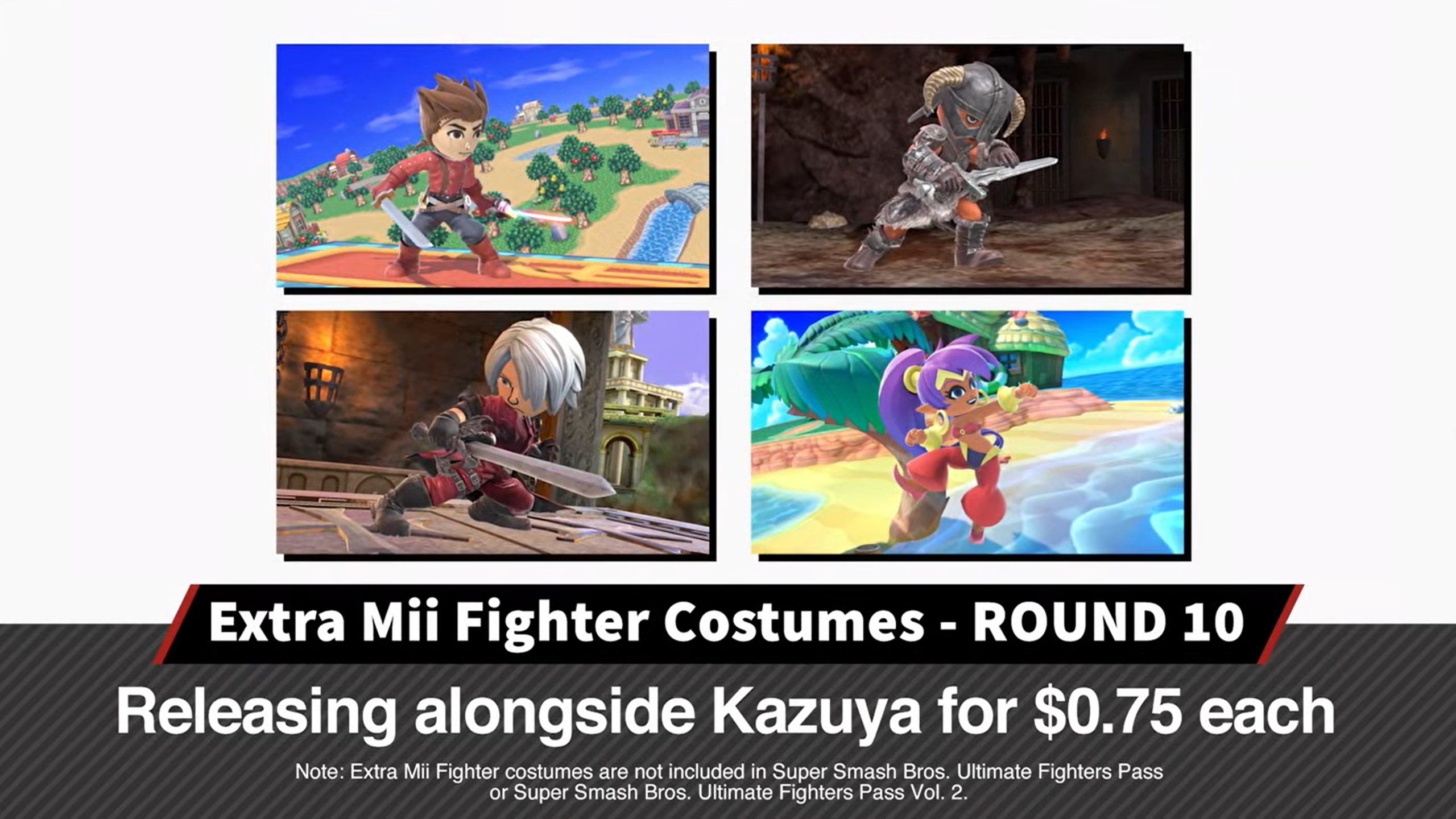 Super Smash Bros. Ultimate director Masahiro Sakurai is currently hosting a presentation to spotlight the game’s new DLC fighter. Though the broadcast has been almost entirely about Kazuya, the next wave of Mii Fighter costumes have also been revealed. The lineup includes Lloyd (Swordfighter) from Tales of Symphonia, Dragonborn (Swordfighter) from The Elder Scrolls, Dante (Swordfighter) from Devil May Cry, and Shantae (Brawler).