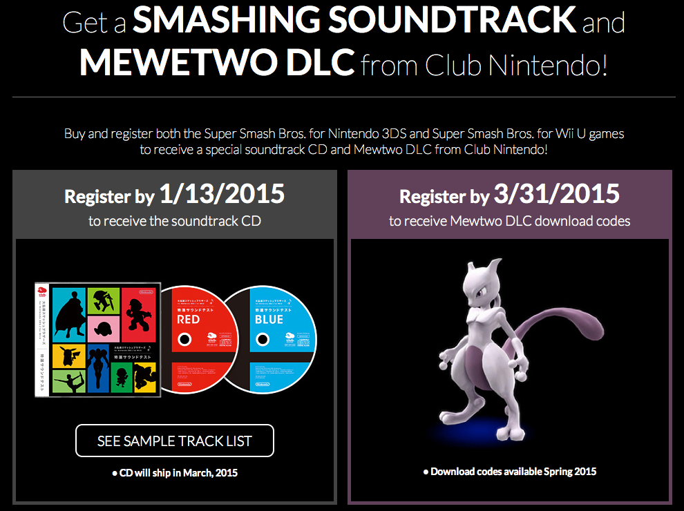 This is a limited time offer so make sure that you register both games by 1/13/2015 if you want the soundtrack and Mewtwo DLC or by 3/31/2015 if you only want the DLC.