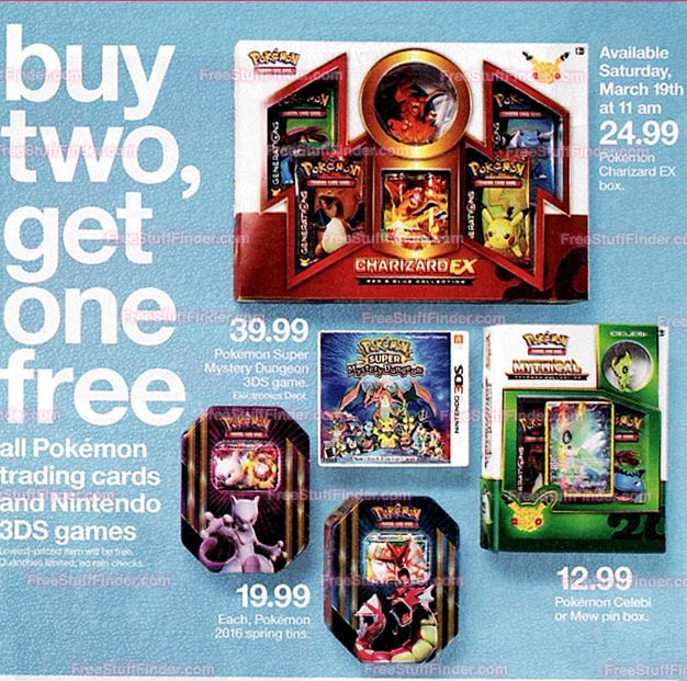 Starting on Sunday, Target will be holding a “buy 2, get 1 free” sale on all 3DS games. This also applies to Pokemon trading cards for those that are interested. The offer should last through March 19.
