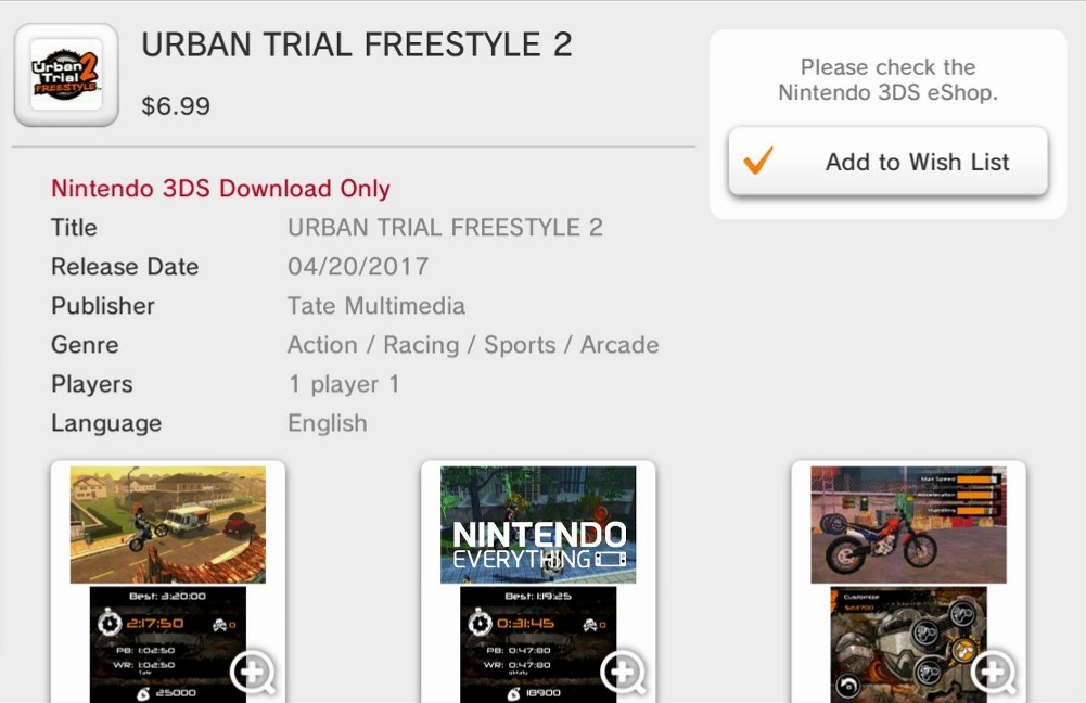 Urban Trial Freestyle 2 previously launched in Europe at the end of March. This coming week, North America is also getting the game. A listing on the eShop has it down for April 20 with a $6.99 price point.