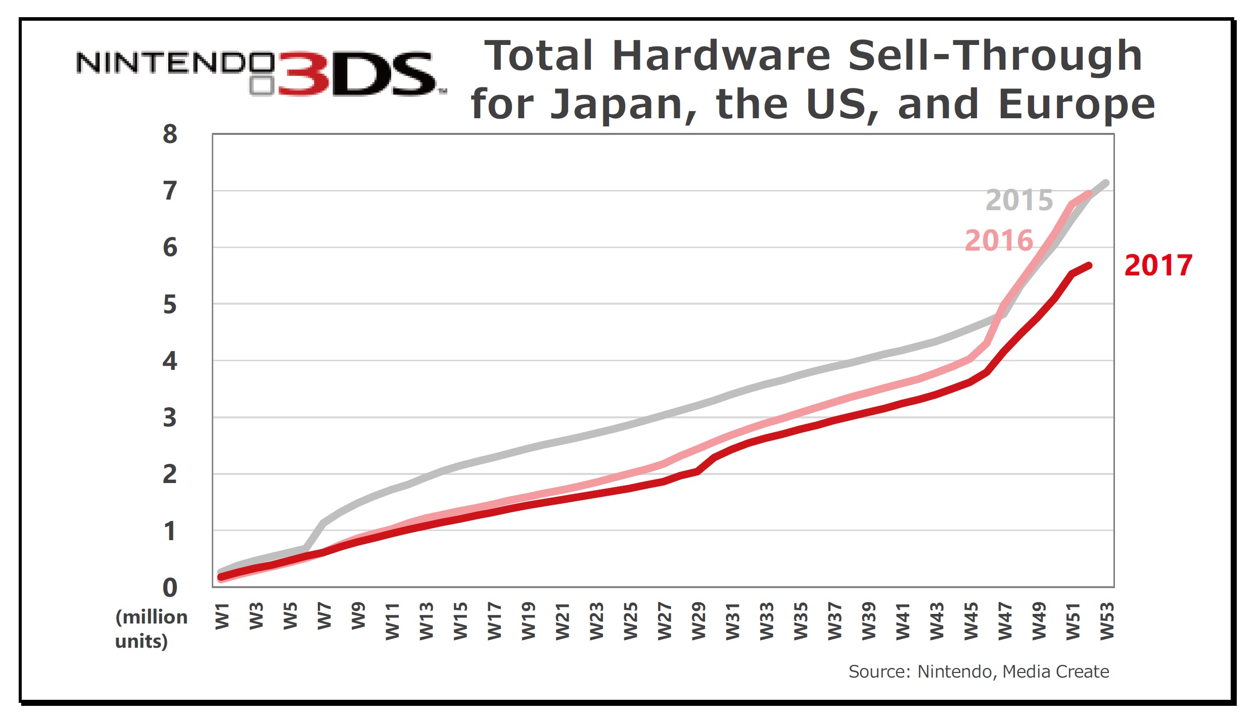 This graph shows changes in Nintendo 3DS hardware sell-through, as a total for the Japanese, US, and European markets combined. Although sales are trending lower than last year, the results from our seventh holiday season sales have maintained stable levels. As explained during the financial results briefing in October of last year, the Nintendo 3DS family of hardware has continued to sell steadily without significant fall-off, even after the release of Nintendo Switch.