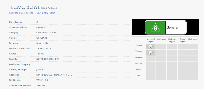 Tecmo Bowl has received classification over in Australia. This is almost certainly for a Virtual Console release, but I can’t say for sure whether it’s for the Wii U or 3DS. Although Tecmo Bowl did come out on the North American 3DS eShop back in 2013, I don’t believe it ever reached PAL regions. I guess we’ll see what’s planned at some point in the future!