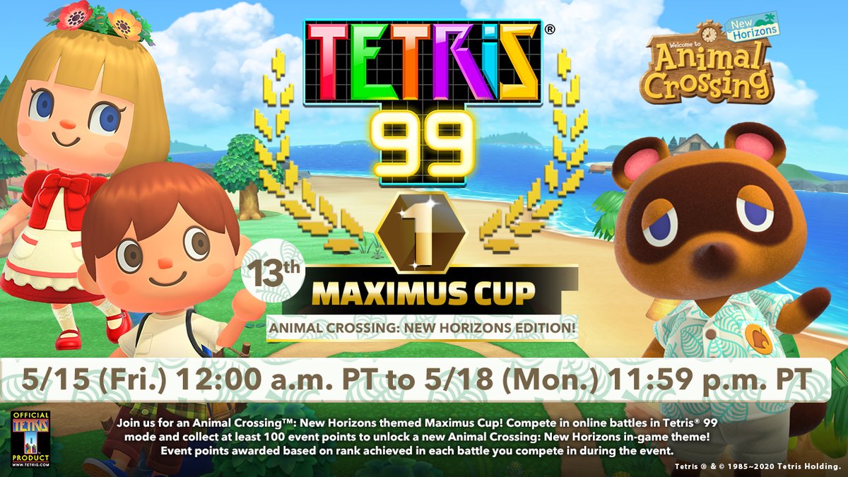 Nintendo has announced that the 13th Maximus Cup will take place in Tetris 99 this weekend. As part of the event, players can earn an in-game Animal Crossing: New Horizons theme. Simply earn 100 points while it’s active to obtain it.