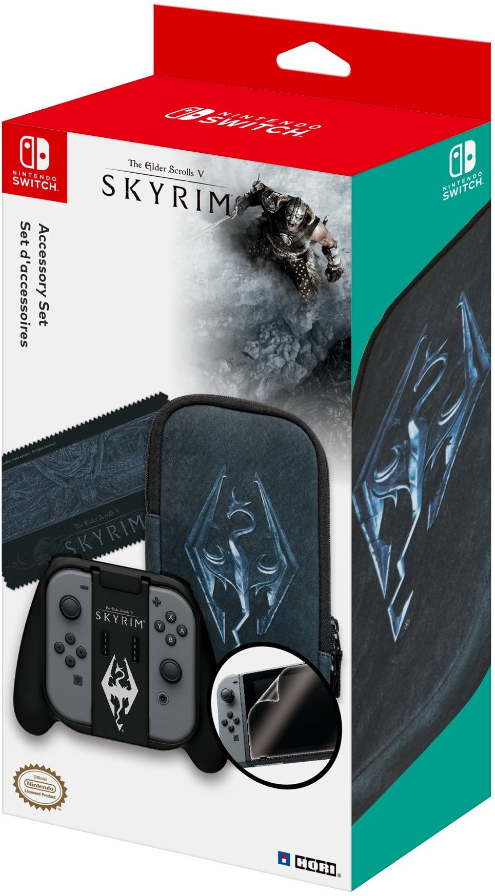 The set comes with a soft pouch, Joy-Con trigger grip, cleaning cloth, and a screen protective filter. Skyrim-themed art and designs are featured.