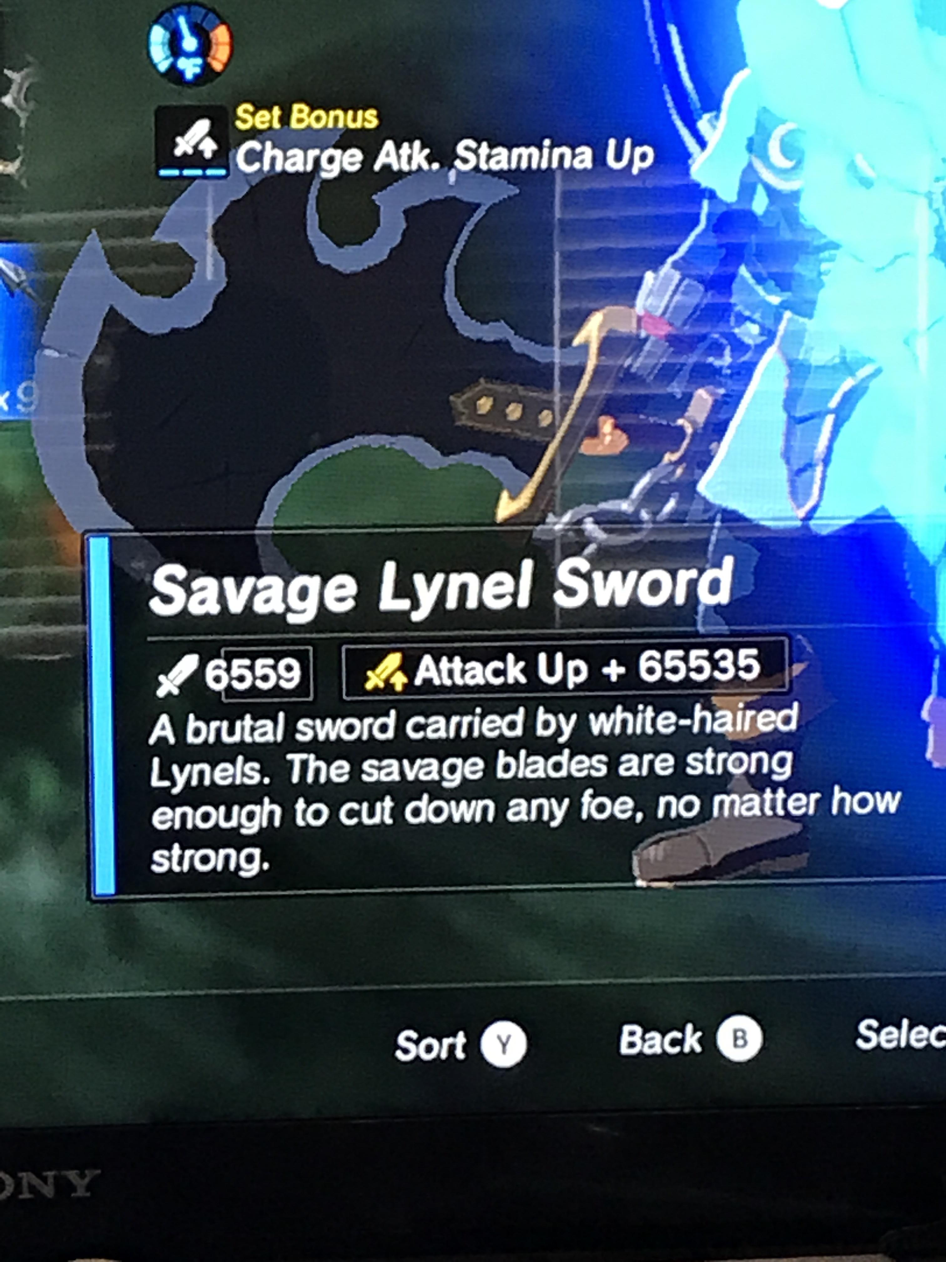 Eastonator12 took down a Lynel after playing the game on Switch. The game crashed, but everything was fine – except for one thing. The Savage Lynel Sword in the player’s inventory carries damage of 6,559 with an “Attack Up” stat of 65,535. 65,535 is the maximum value for a 16bit unsigned integer in the world of programming, in case you’re interested.