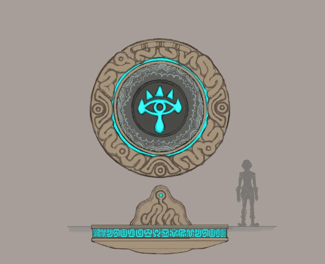“This concept art showcases the design of the lift entrance to Shrines of Trials, which are located in variety of locations throughout the land of Hyrule. In the center, there’s a Sheikah Eye symbol.”