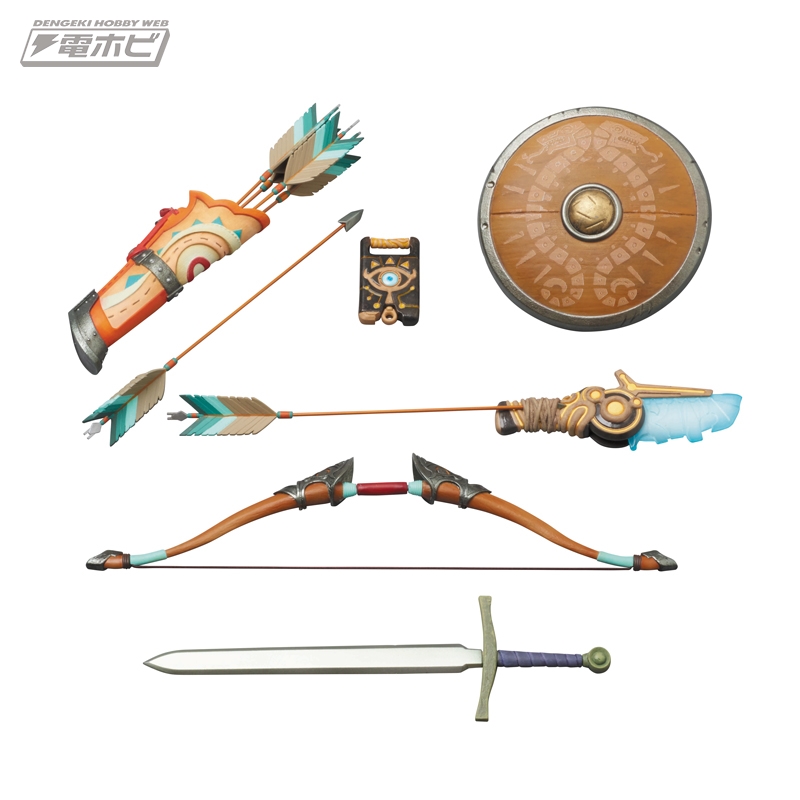 The new Link figure features detailed accessories (a bow, quiver full of regular arrows, one of the special arrows shown in first trailer, a sword, shield, a hooded cloak, and the Sheikah Slate) and interchangeable hands and heads that can be used to customize his appearance. Additionally, two heads can be switched out so that Link’s appearance changes to a shout. While the figure itself (the head in particular) is made of PVC, though the clothes are made from cloth.