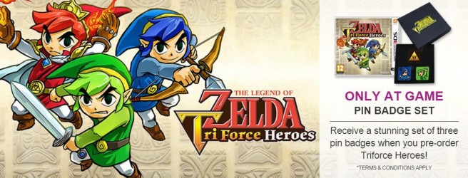 Order Legend of Zelda:Triforce Heroes for 3DS & get an exclusive Pin Badge Set, only at GAME http://t.co/XYFOyAD8tu pic.twitter.com/9Qsdd2l1lS