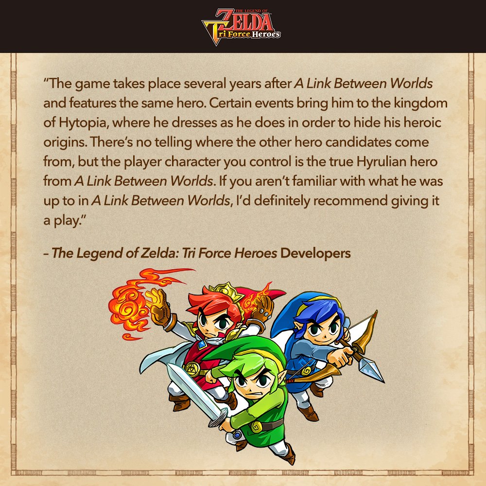 A few days ago, Nintendo of America presented fans with a series of possible questions on Twitter that could be submitted to the developers of Zelda: Tri Force Heroes. The first response has now come in, which deals with the game’s placement in the series timeline. Take a look at the image above for the official response.