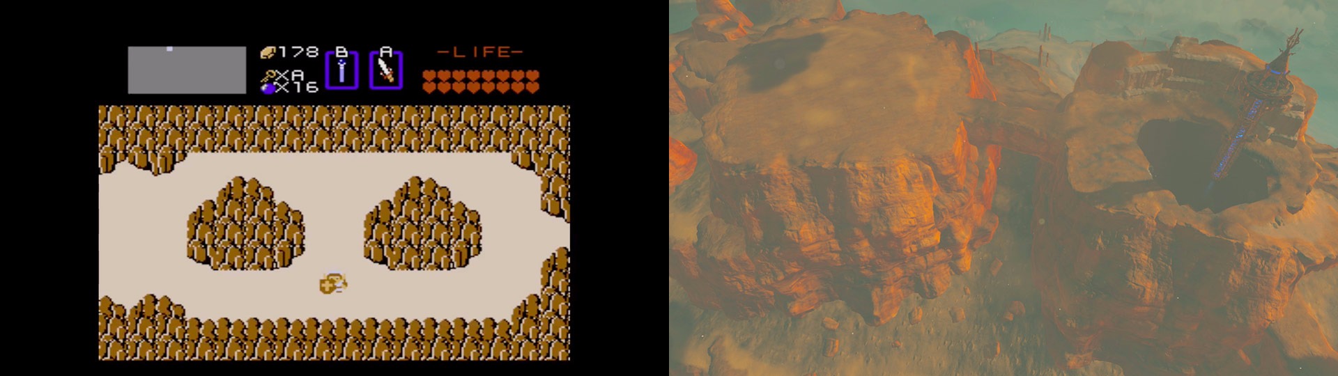 – Spectacle Rock: two rocks form the shape of glasses in both games, but it now looks more like a mountain than just a rock in Breath of the Wild