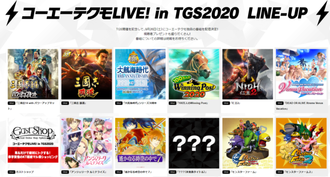 The full list is included below, courtesy of Gematsu, and the graphic on their website (with a rough translation) has also been added as well. Koei Tecmo’s presentation at TGS 2020 is planned to run from September 23 to 27 with the Koei Tecmo Channel taking place on September 26.