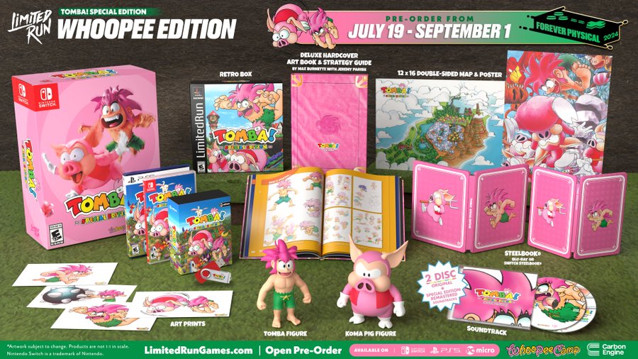 The title will be sold standalone, but there’ll also be a Classic Edition and Whoope Edition. With the Classic Edition, you’ll get a steelbook, poster, and the original and Special Edition remastered soundtracks in a retro box based on Tomba’s original release. The Whoope Edition contains everything in the Classic Edition plus a hardcover art book/strategy guide, art prints, and Tomba and Koma Pig figures.
