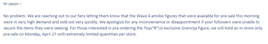 Toys “R” Us started sending out emails yesterday about amiibo pre-orders that were accidentally cancelled due to an internal error. You likely received one of two messages. The first one states that your order (or orders) was automatically reinstated. We’re also now aware of a second that informs consumers that their pre-order couldn’t be reinstated, but the items can be re-ordered.